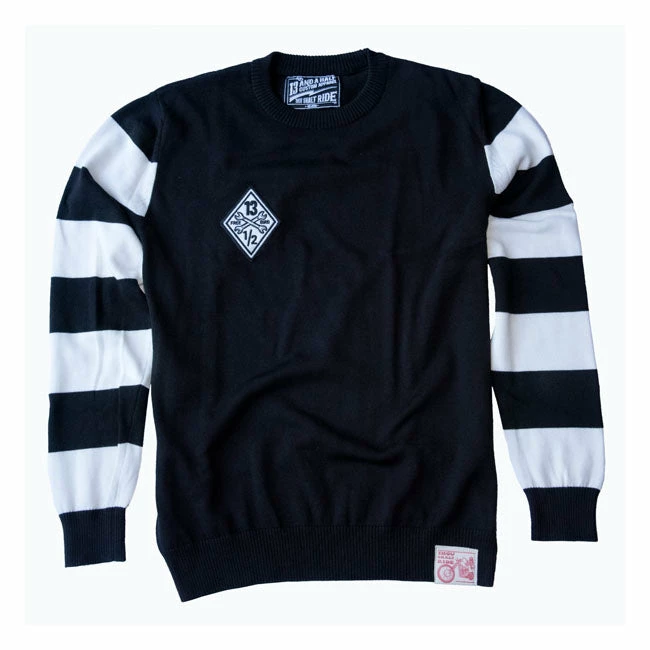 The 13 and a Half Free Bird Outlaw sweater is a knitted, 100% cotton, lightweight sweater with striped sleeves. A great addition to your wardrobe.