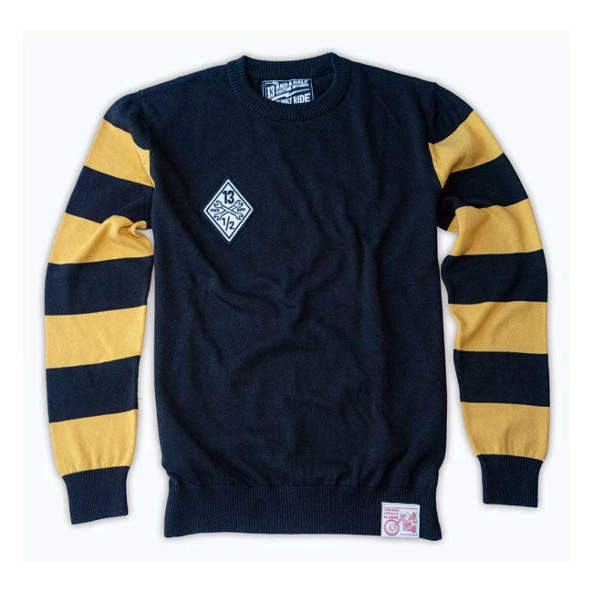 The 13 and a Half Free Bird Outlaw sweater is a knitted, 100% cotton, lightweight sweater with striped sleeves. A great addition to your wardrobe.