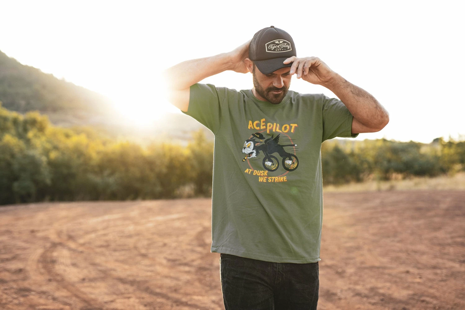 In the air or on the asphalt, no matter if your mount has wings or wheels, you must brave the elements and rush to your goal, without compromise! Lurking in the shadows, you wait until dusk to strike… The Ace pilot T-shirt is a nod to the patches worn by bomber pilots in the 1940/50s.