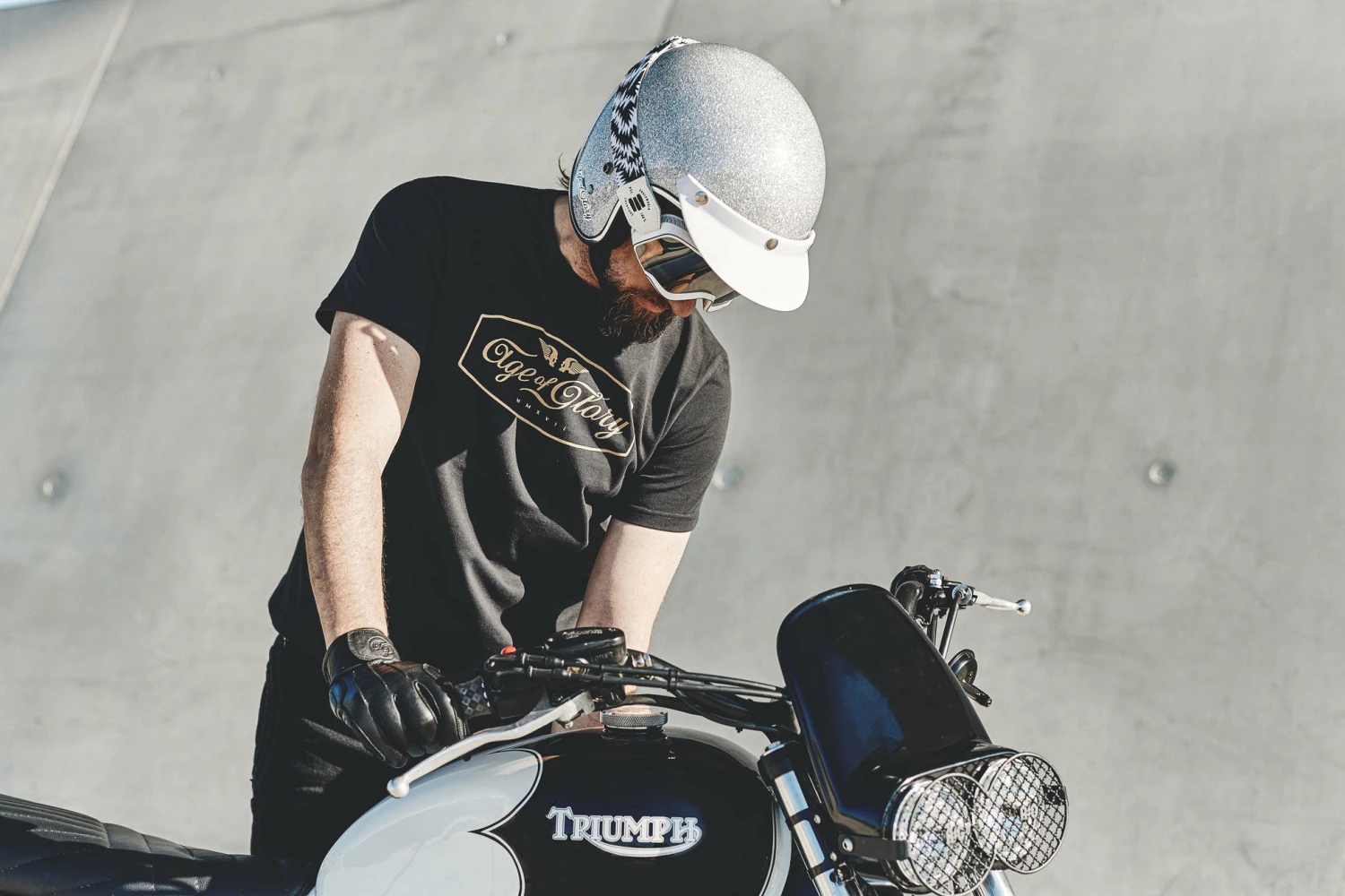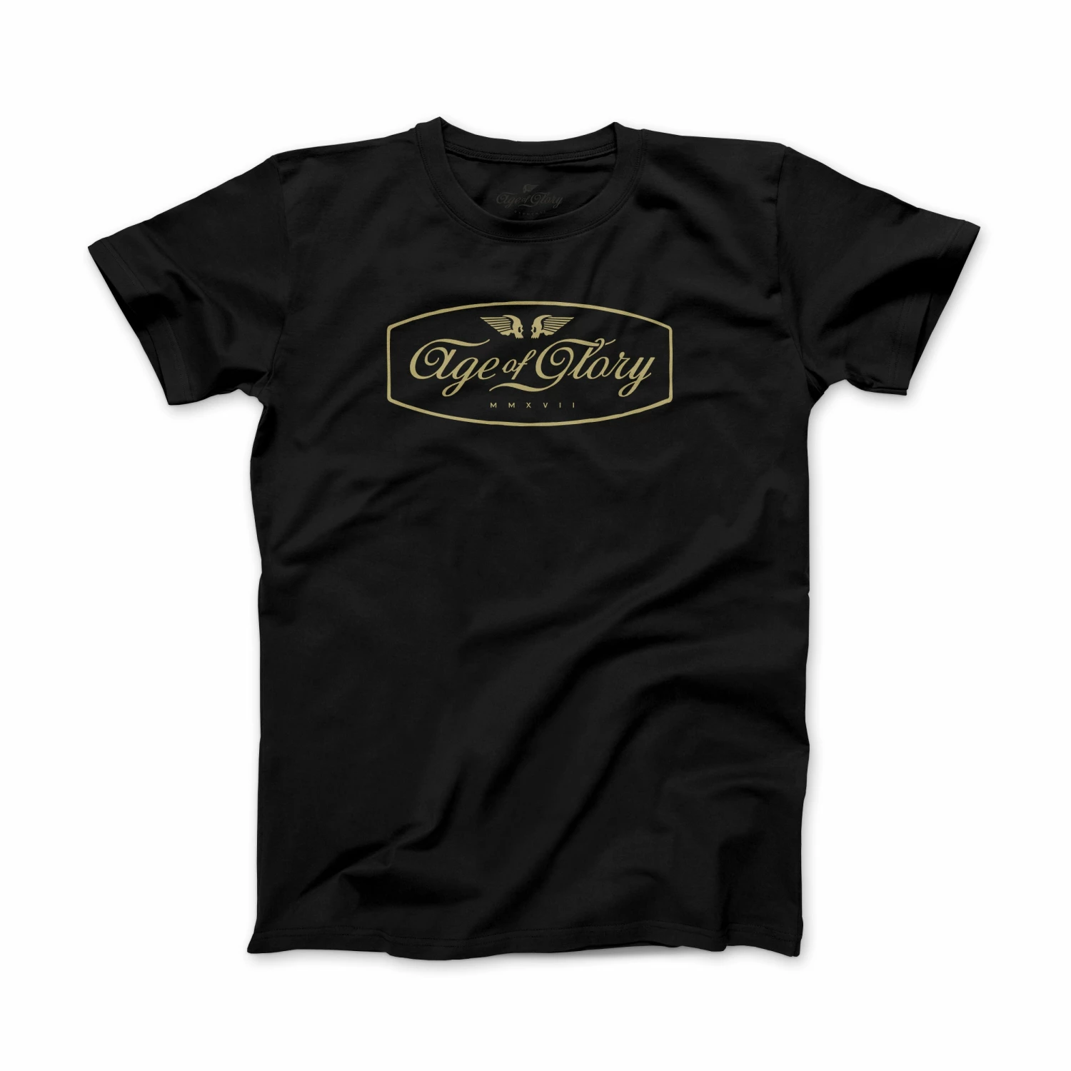 This design is our new logo tee-shirt representing Age of Glory’s blazon logo in gold on a slightly washed black tee.
