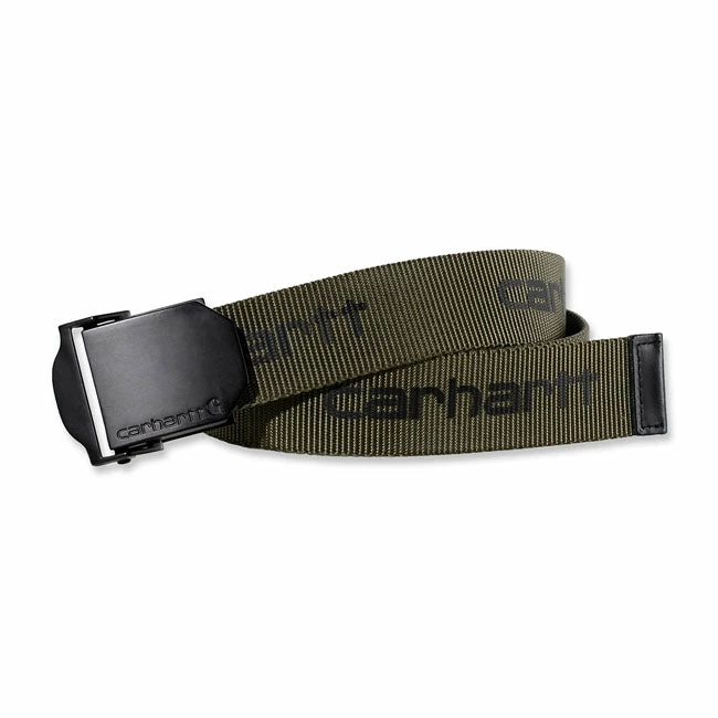 Up and down ladders, in the workshop or on the bike, this Carhartt Webbing men′s belt provides a just-right fit. It′s made of durable heavy-duty webbing in a signature Carhartt graphic print. The plaque buckle with engraved logo pulls tight and holds the belt in place.