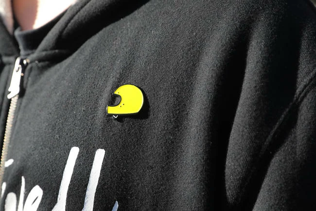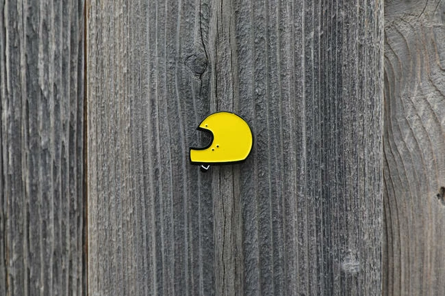 Soft enamel die-struck pin. 1” wide with single-post, black rubber backer. Our Safe-T Yellow Gringo Helmet in a pint-sized pin so you can bring it everywhere.