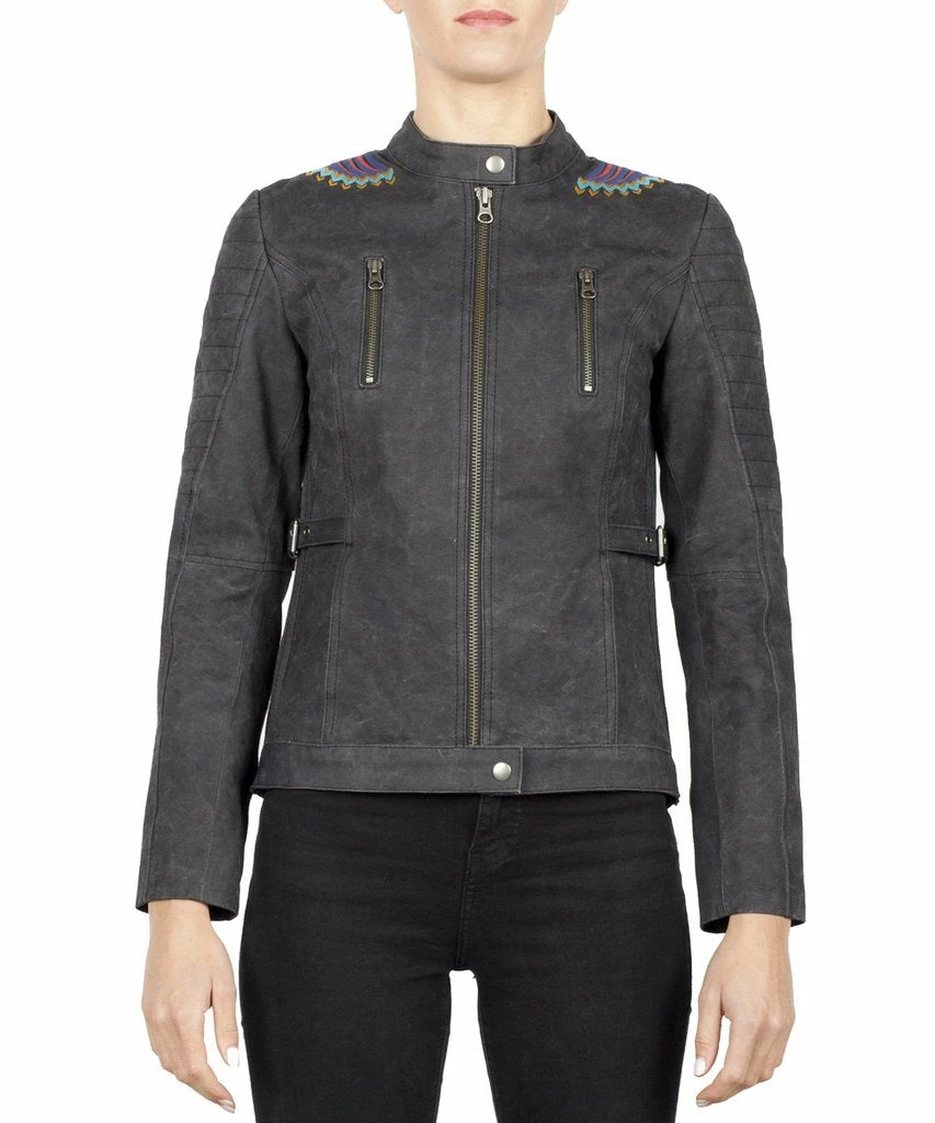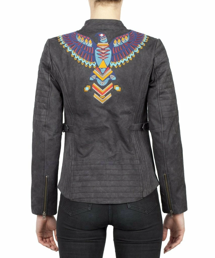 Made from a 12oz waxed cotton canvas this women’s motorcycle jacket features elasticated sides and waist buckle adjustments for a comfortable fit. An embroidered stylised Thunderbird wraps around the back neck. Four zippered pockets and an inside pouch pocket make carrying all your necessities a breeze. Includes Aramid fibre lining panels and CE approved armour for protection.