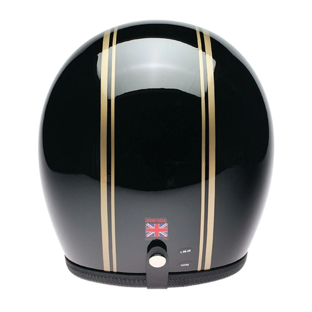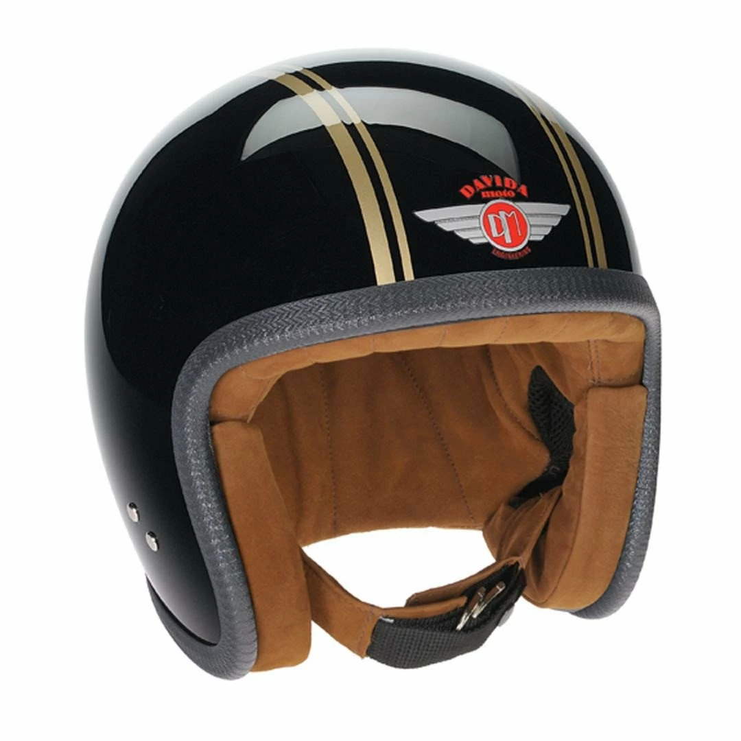 Davida helmets are the only certified motorcycle helmets to be Made in England, using fibreglass composite shells & EPS shock absorption liners, fitted with a leather goggle-strap retainer & are secured using webbing strap & Double D rings.