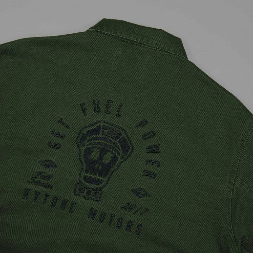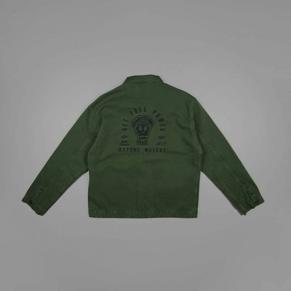 A very stylish short casual jacket perfect over the top of a T-shirt. Accented with black embroidery on the back, button cuffs and front and three pockets.