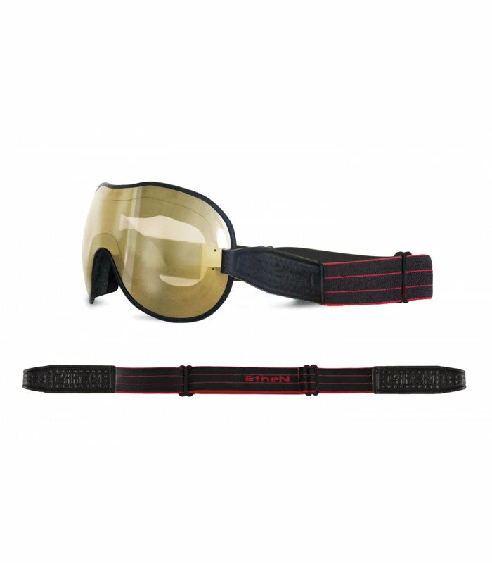 Ultra shock absorber lens, photochromic and mirror bronze effect. It is an innovative lens combining the sharpness of the best mineral lens with impact resistance of an organic lens. The elastic strap has eco-leather finishing branded Ethen. The goggle colours recall the 50/60s design.