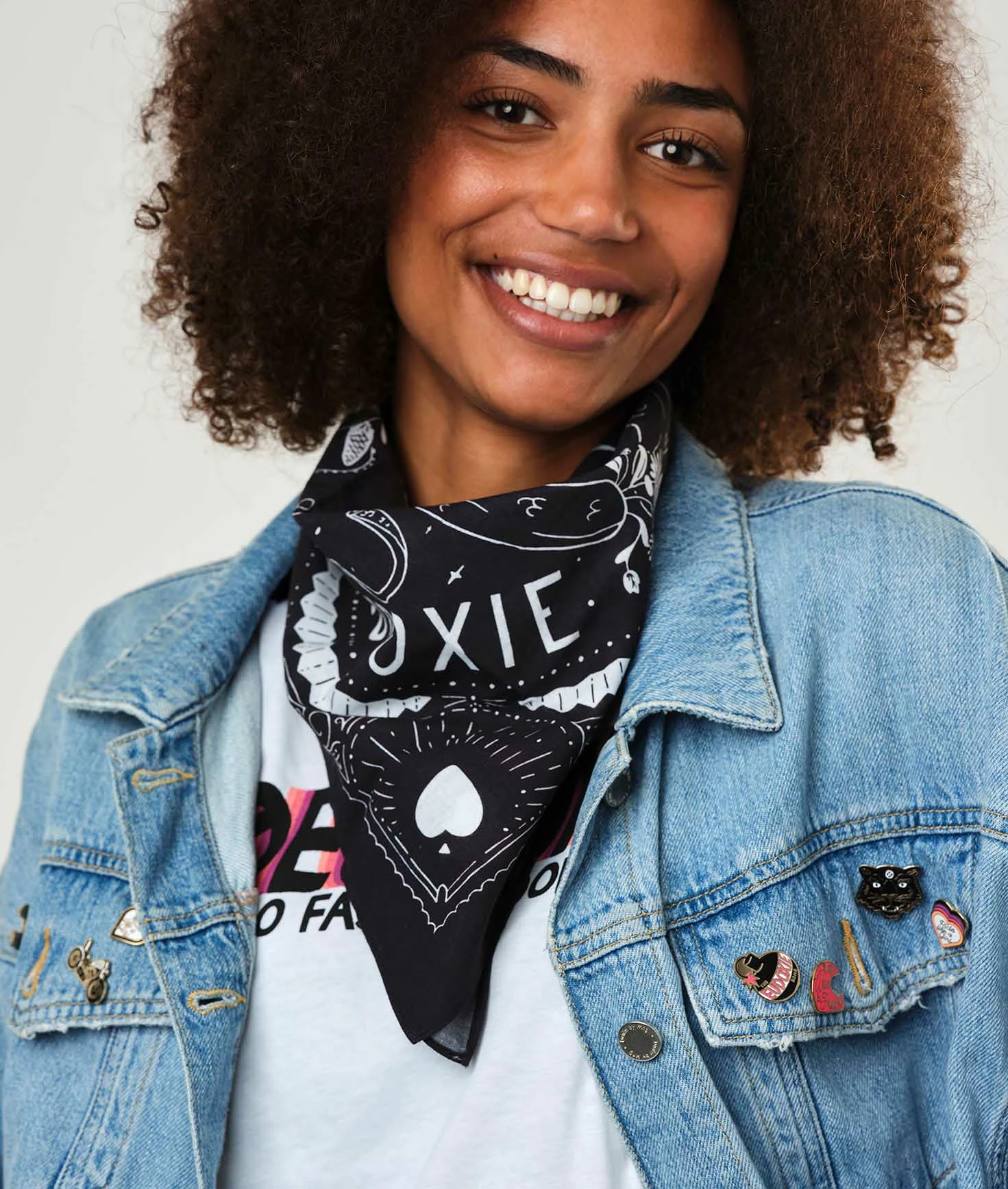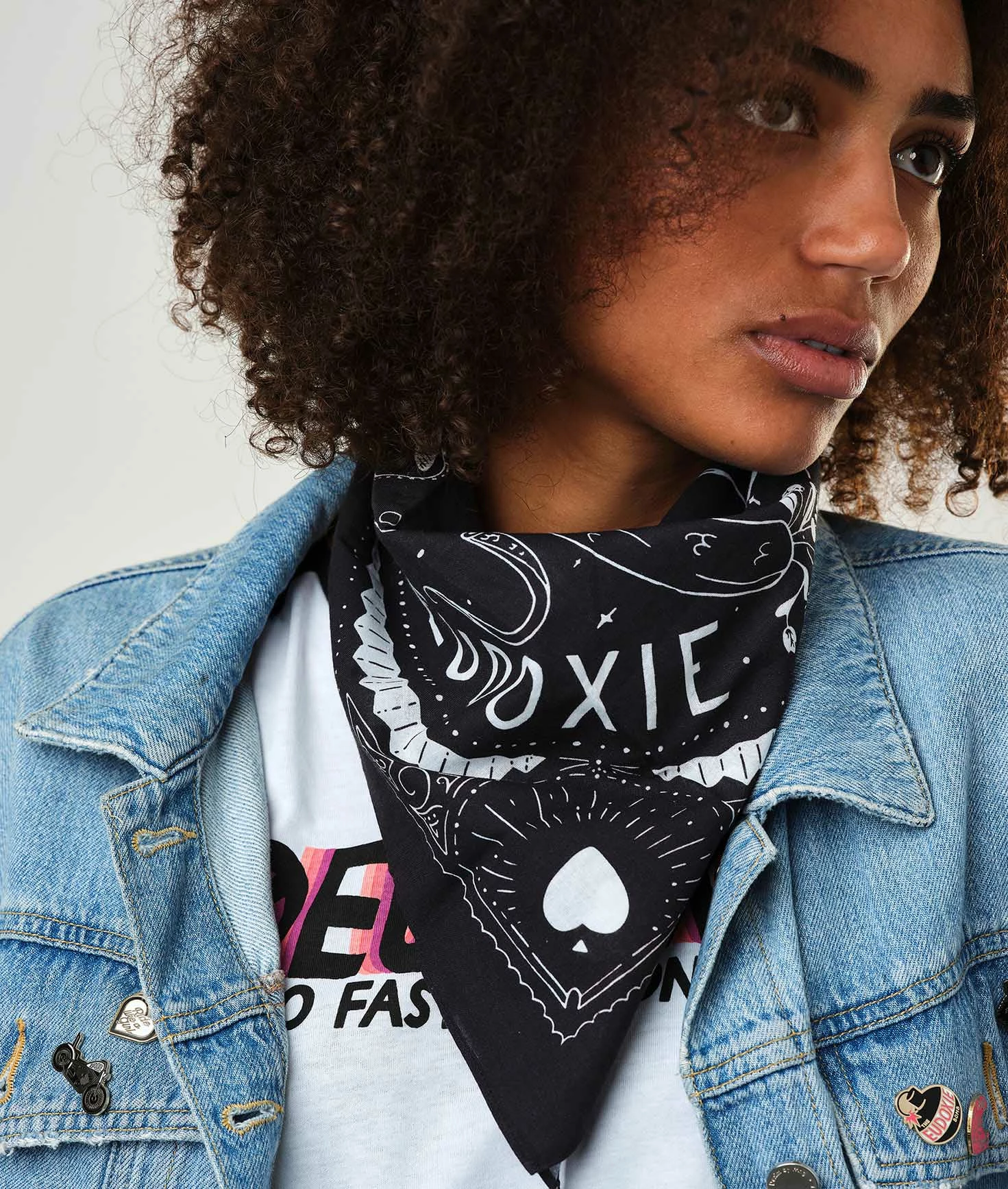Black bandana scarf 54cm square 100% cotton, printed white on black with a superb design that mixes cards with a snake and a mystical hand.