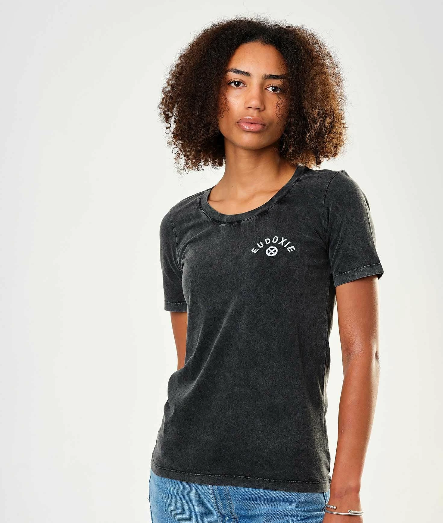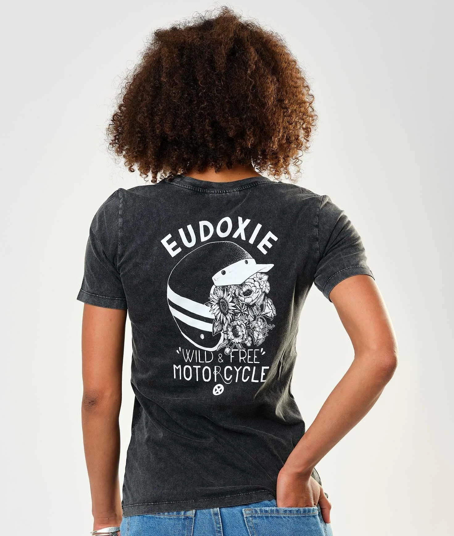 The Bonnie t-shirt is made for the motorcycle. It is by far the bestseller! In general it is the first t-shirt chosen when you discover the Eudoxie brand. It is Black with a white screen printing on the back and on the heart. Ideal to wear under a Burning heart perfecto leather. Cotton is really soft because it is 100% organic and made in Portugal. It is designed by Goldy. It is very appreciated for its feminine and rock side.The graphic appears on several products, like the tank top and sweatshirt.
