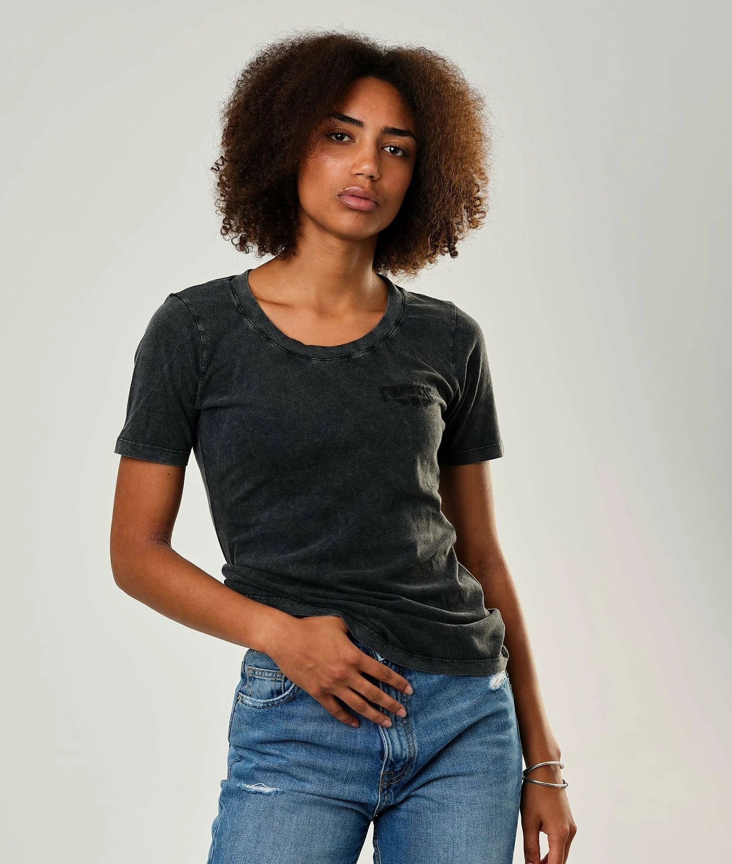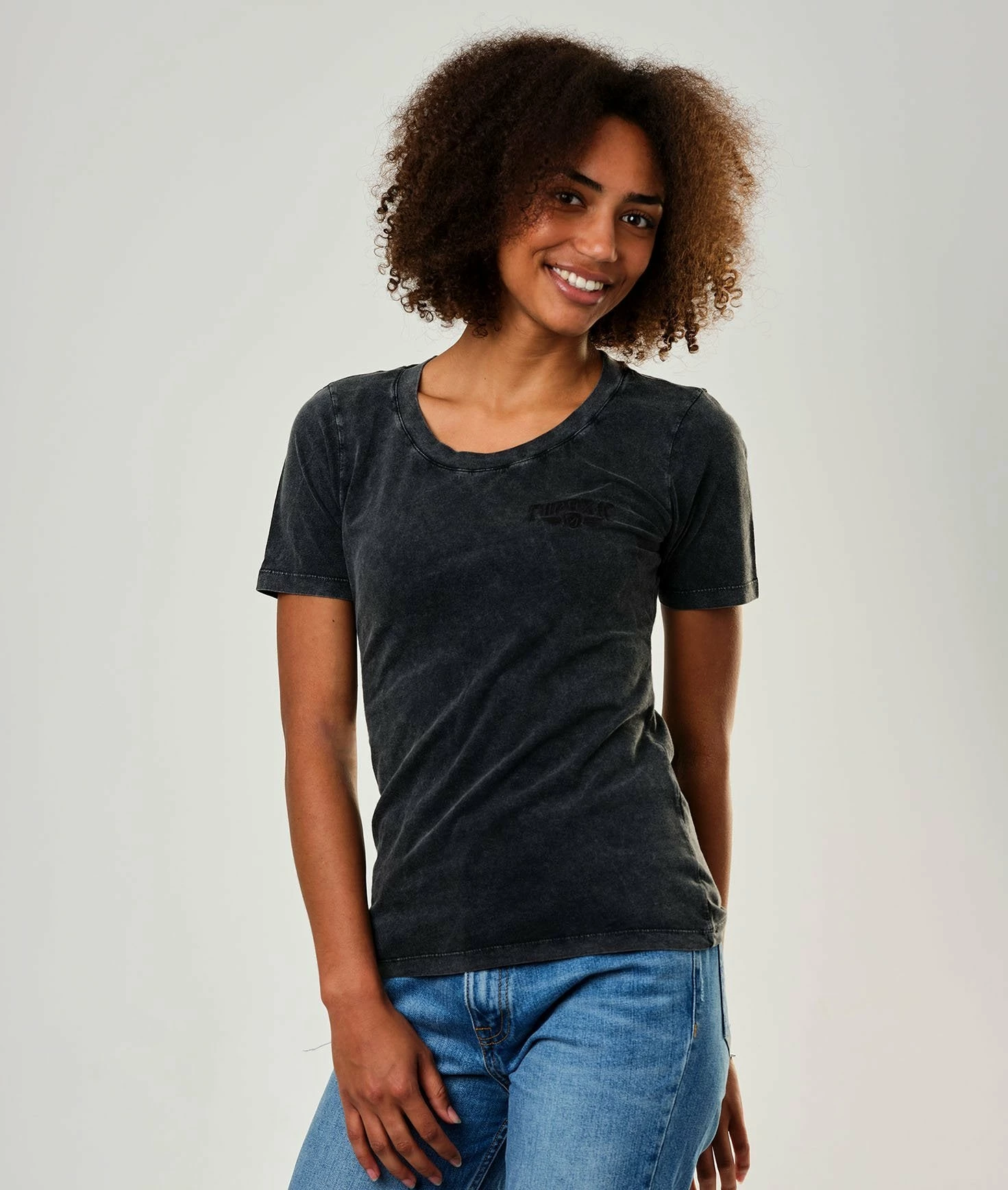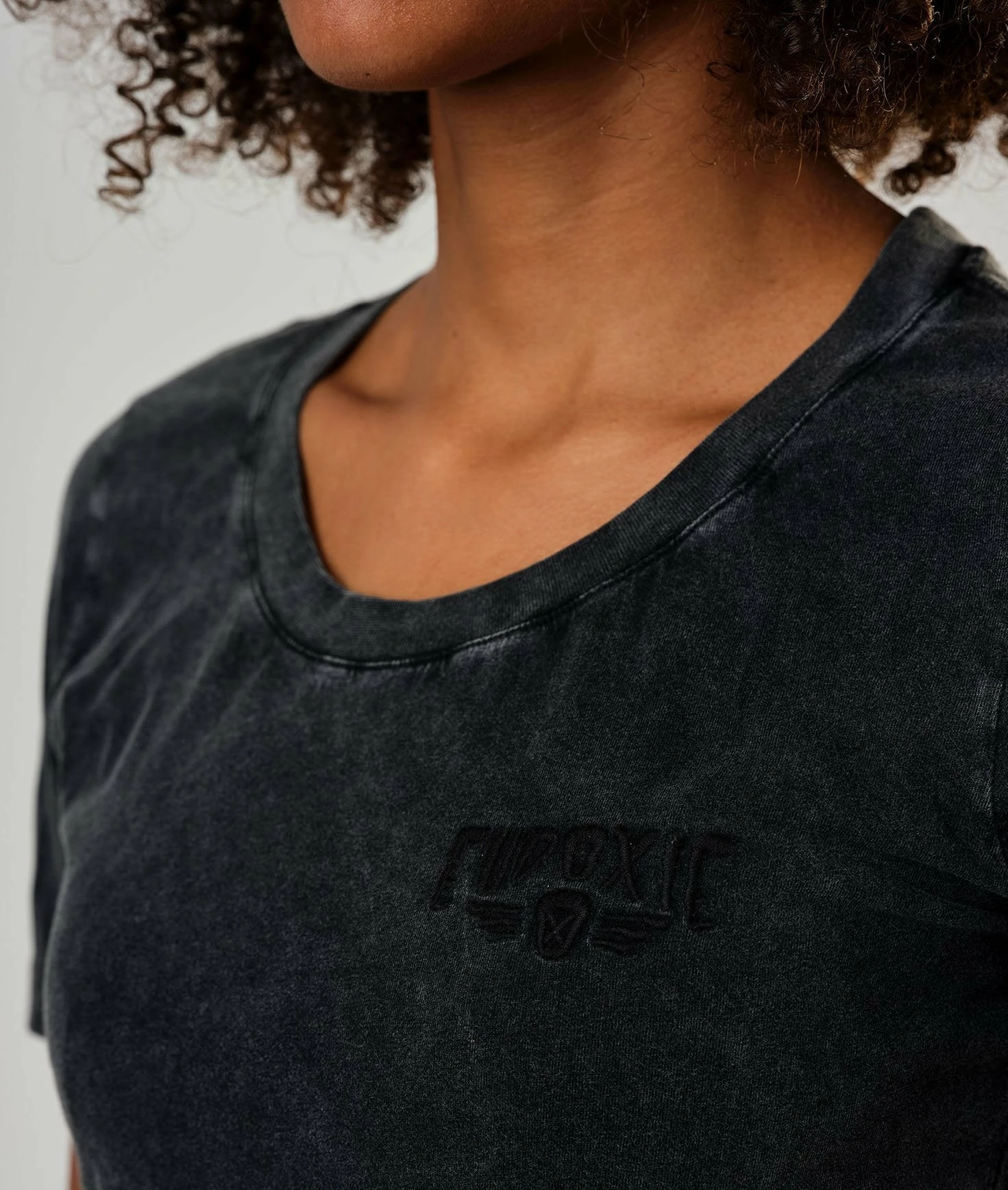 This t-shirt is basic, but you will love it! Its faded black grey and will please you because it goes perfectly with any outfit. It is quite simple, but effective. Eudoxie is embroidered on the heart, with the logo. If you have the eye, you will see that the typo of the logo is not that usually used 😉(everything is in the detail!). The vintage embroidered black t-shirt is very soft because it is made of organic cotton in Portugal! The design is by Goldy, Eudoxie’s graphic designer who takes care of everything! It is a corpo t-shirt which corresponds to the “Smoky Roses” collection.