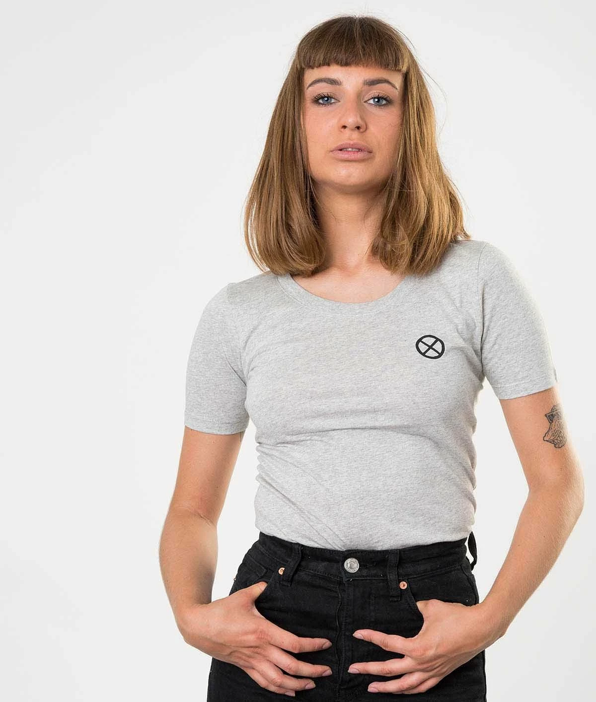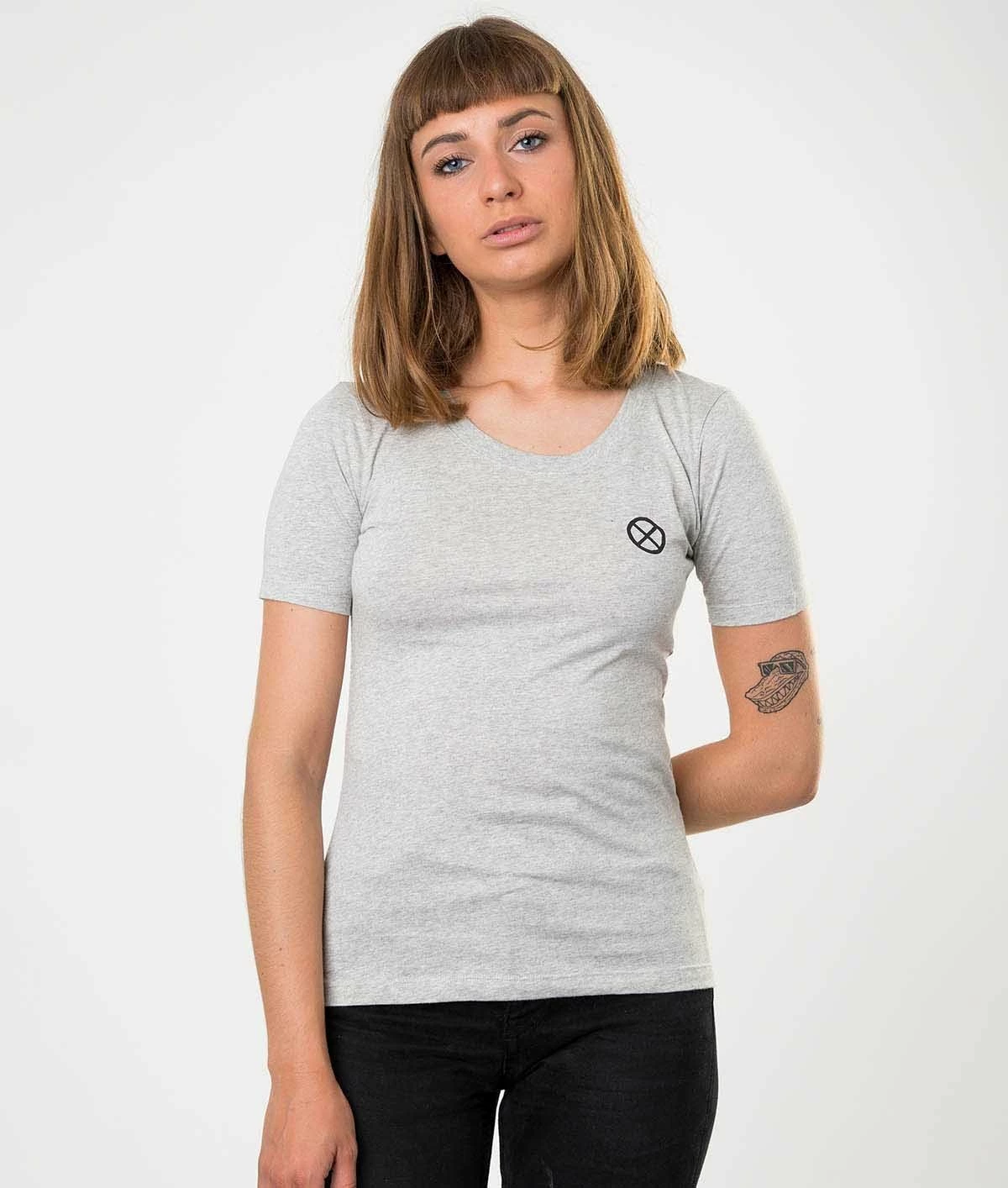 The Bonnie t-shirt is made for the motorcycle. It is by far the bestseller! In general it is the first t-shirt chosen when you discover the Eudoxie brand. It is light grey mottled with a black screen printing on the back and on the heart. Ideal to wear under a Burning heart perfecto leather. Cotton is really soft because it is 100% organic and made in Portugal. It is designed by Goldy. It is very appreciated for its feminine and rock side.The graphic appears on several products, like the tank top and sweatshirt.