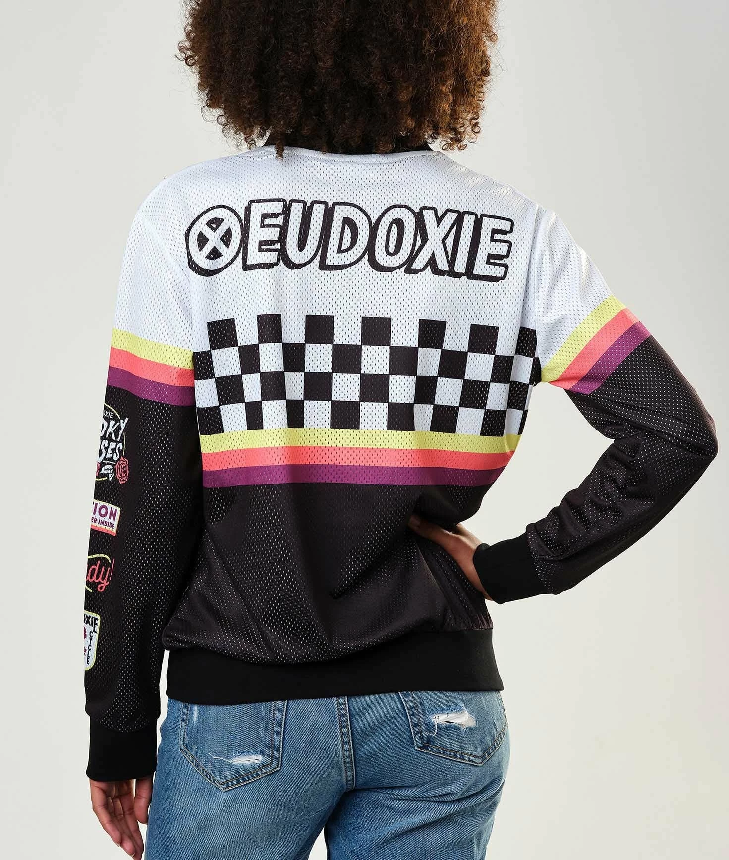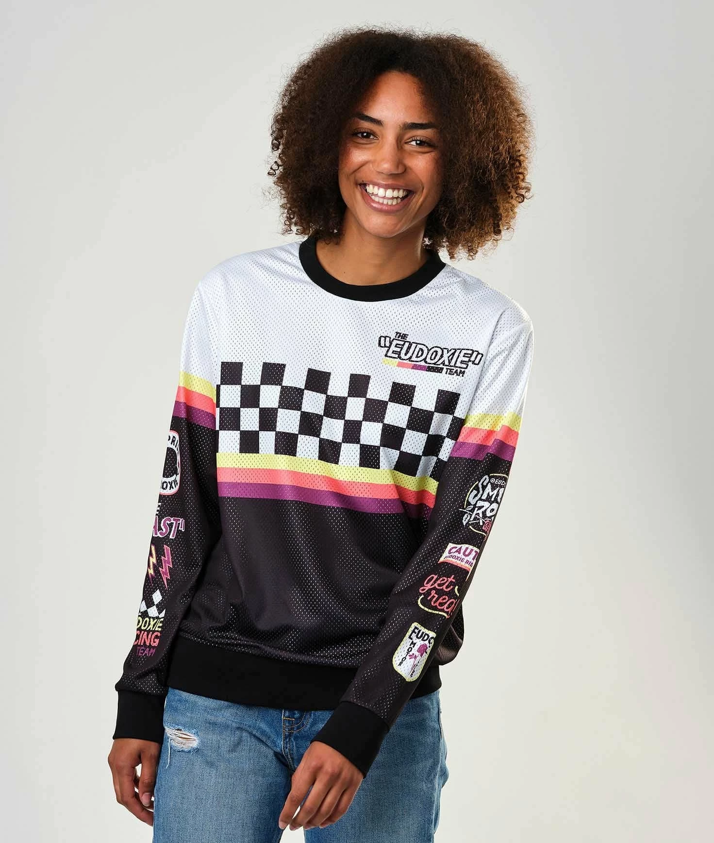 Designed by Goldy, the co-founder of the brand, this is a multi coloured chequer flag design motocross style vintage jersey, designed by women for women and men alike.