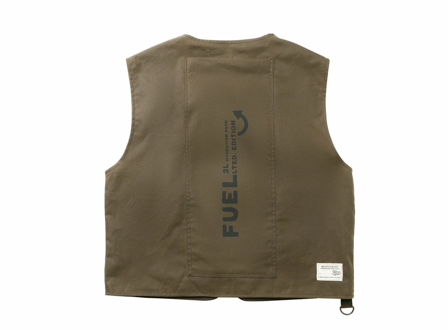 A water-resistant oilskin cotton vest with multiple front pockets and a compartment with a 3ltr hydration pack in the back. It comes in a numbered edition, which means each vest is unique, and with time its appearance will only improve.
