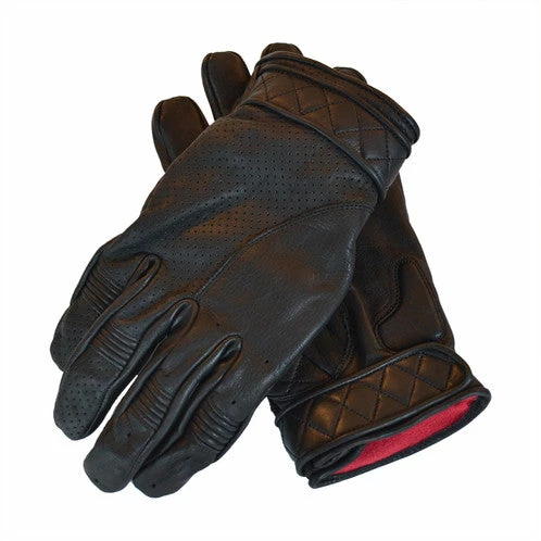 The short bobber motorcycle gloves are a tighter fitting pair of gloves designed for ultimate comfort when riding. With a reinforced palm and finger/thumb area, these gloves are built to last, and come with a quilted leather, velcro wrist fastening to safely secure your fit. This quilting, plus other perforated and ribbed stylings ensures that these gloves provide that classic yet modern cafe racer look. Lined with traditional red fleece, these gloves are are perfect for warm weather riding from spring through summer and autumn too!