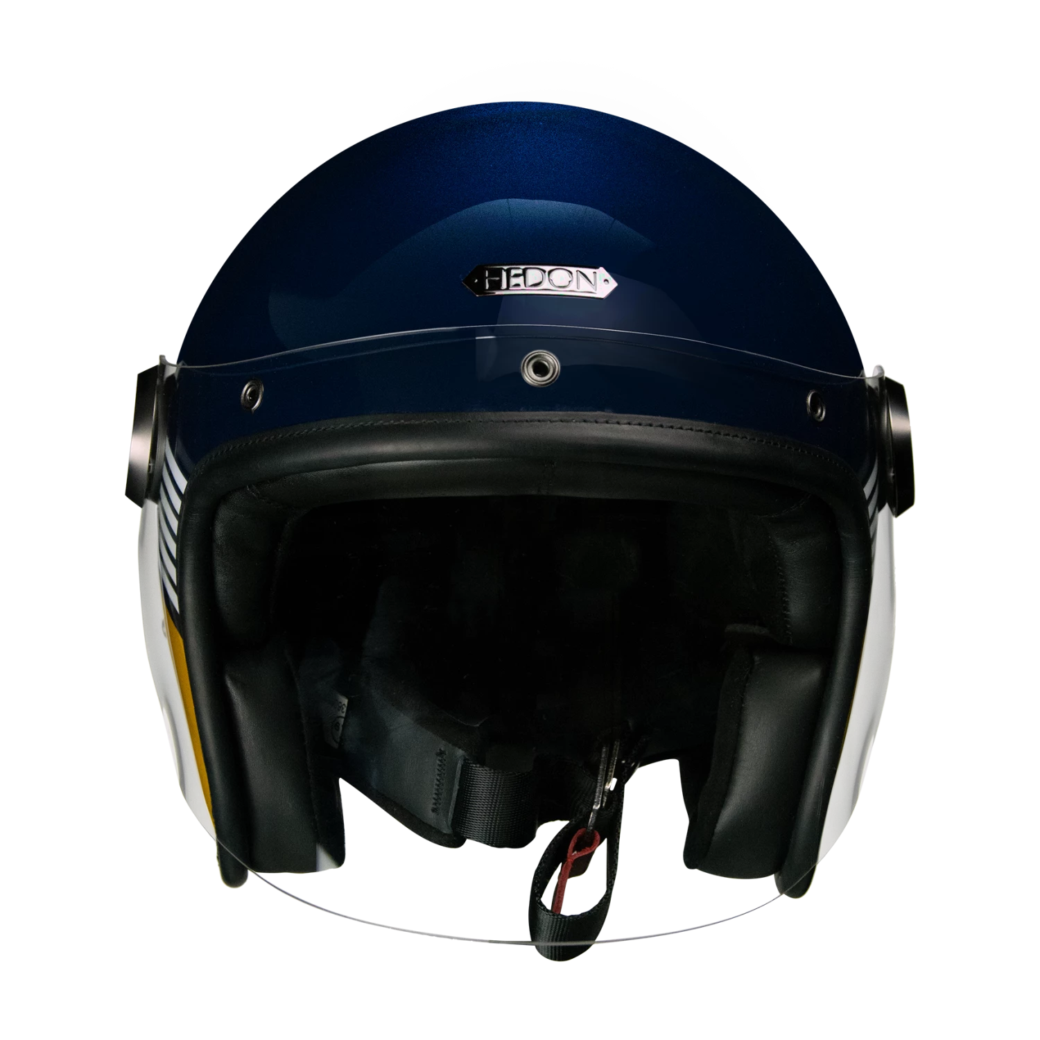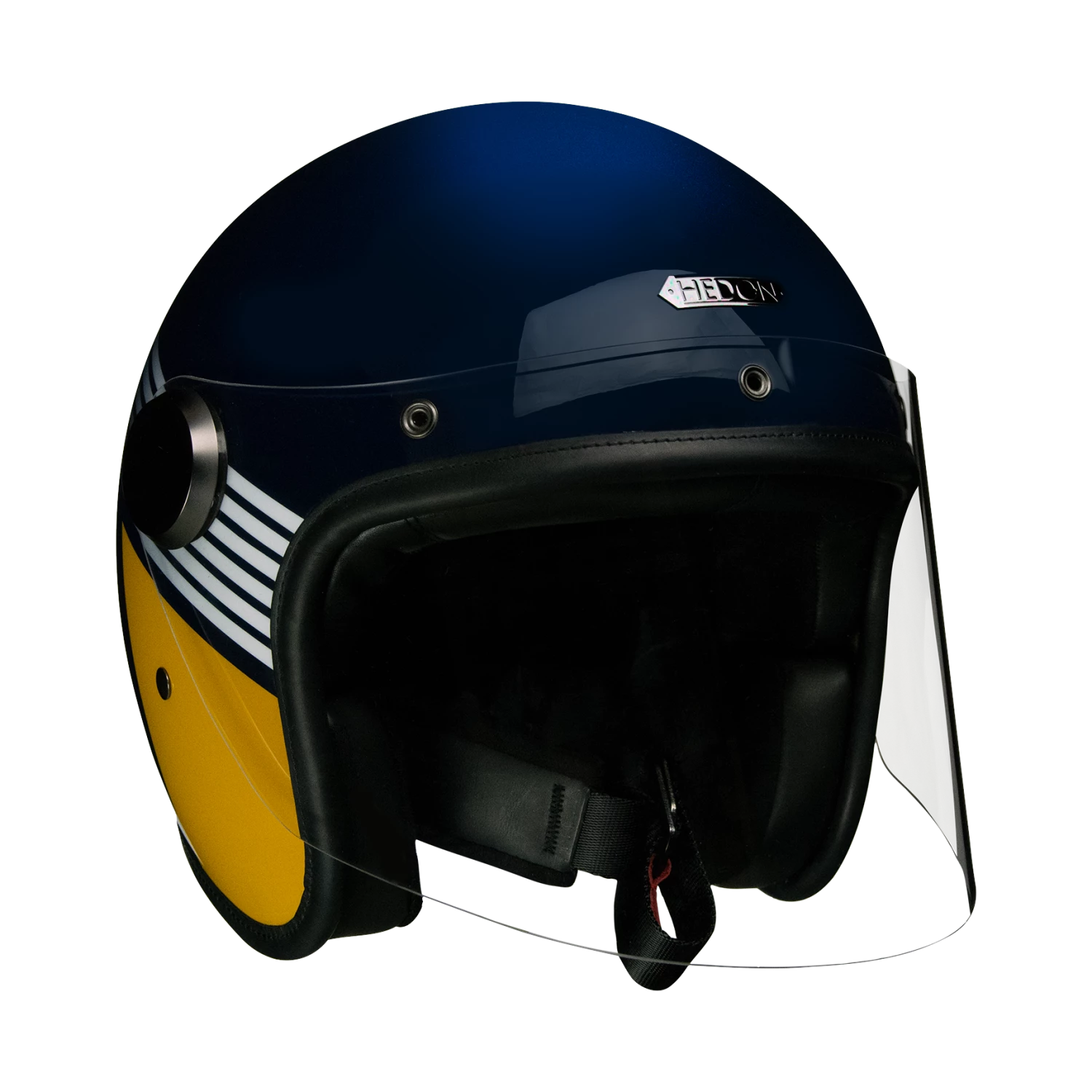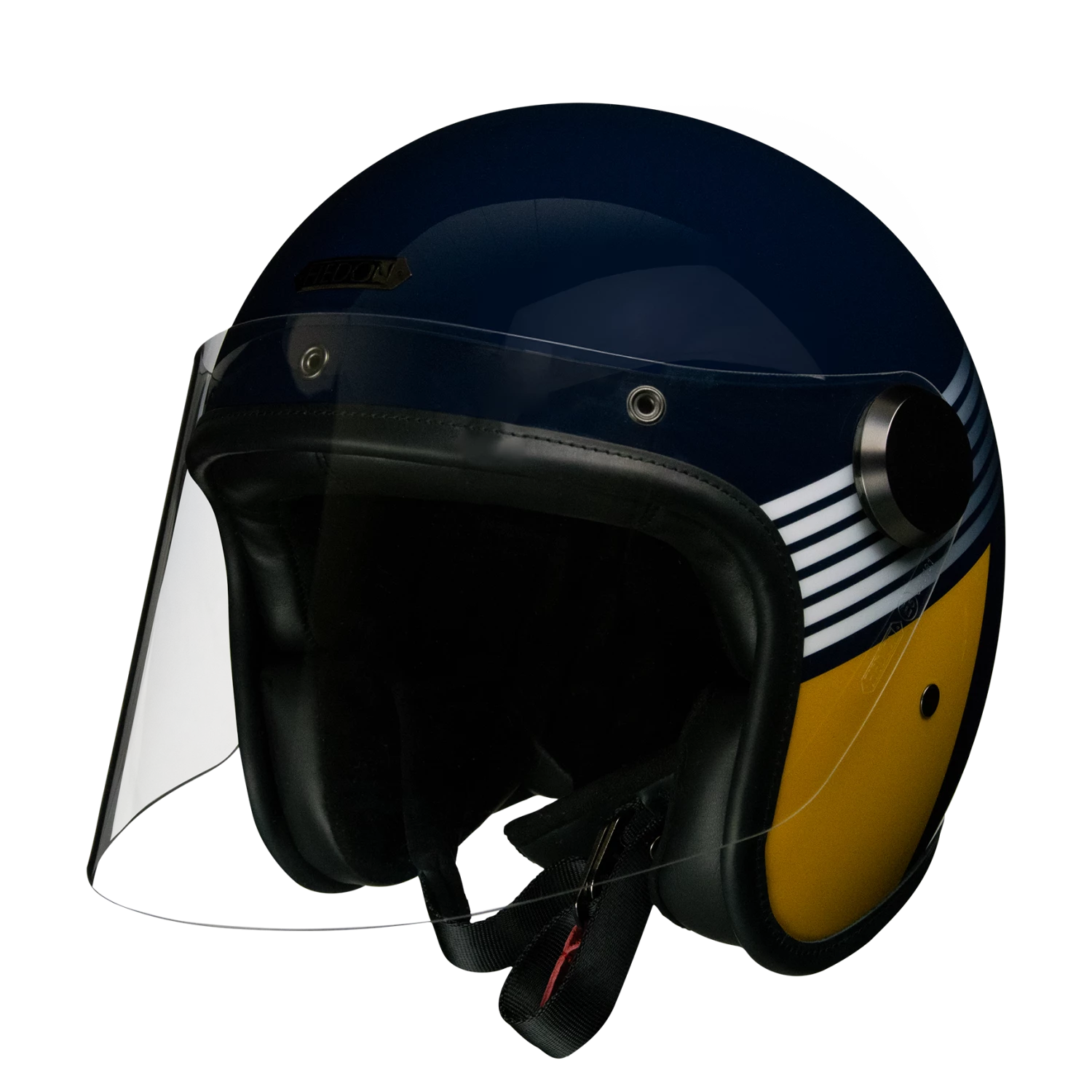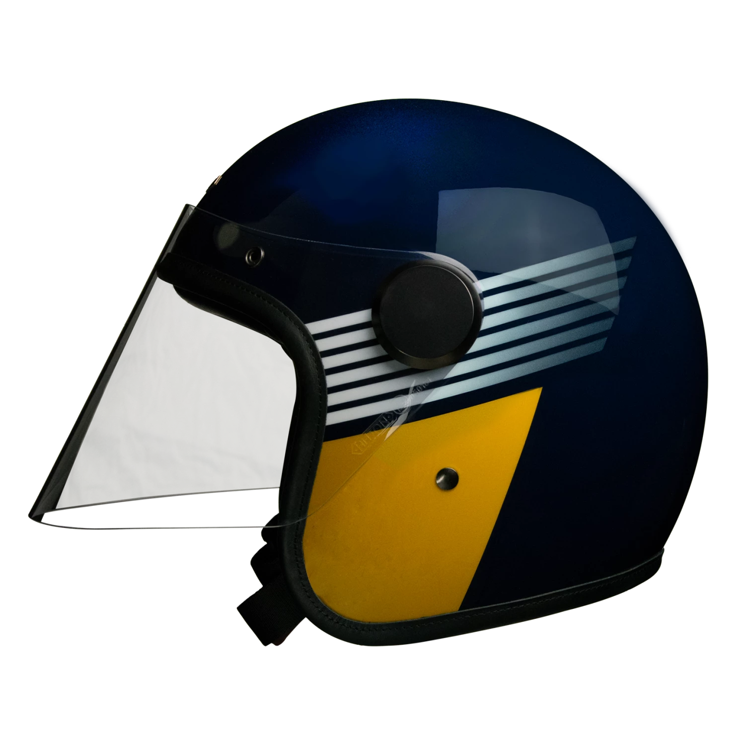 • Midnight blue base with yellow and white striped shell, gloss finish