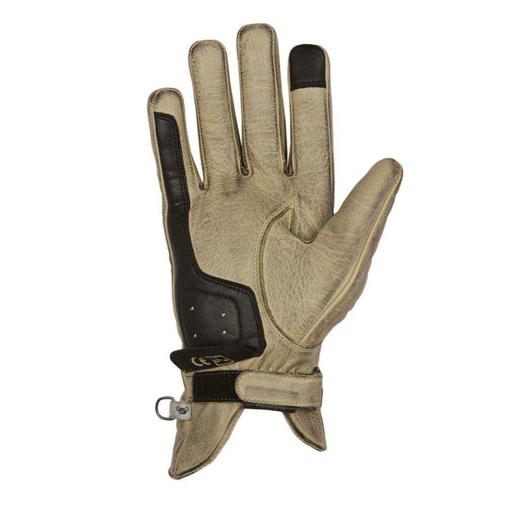 The Condor Summer Motorcycle Glove in beige/black. A full grain goat leather glove with a lightly waxed touch which gets a “used” look over time. Waterproof and breathable membrane. CE approved.