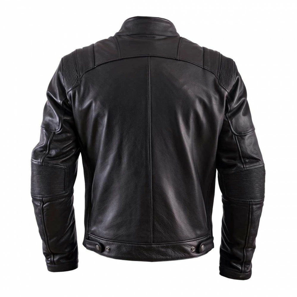 Black leather motorcycle jacket with natural, smooth, sleek and lightly waxed leather.