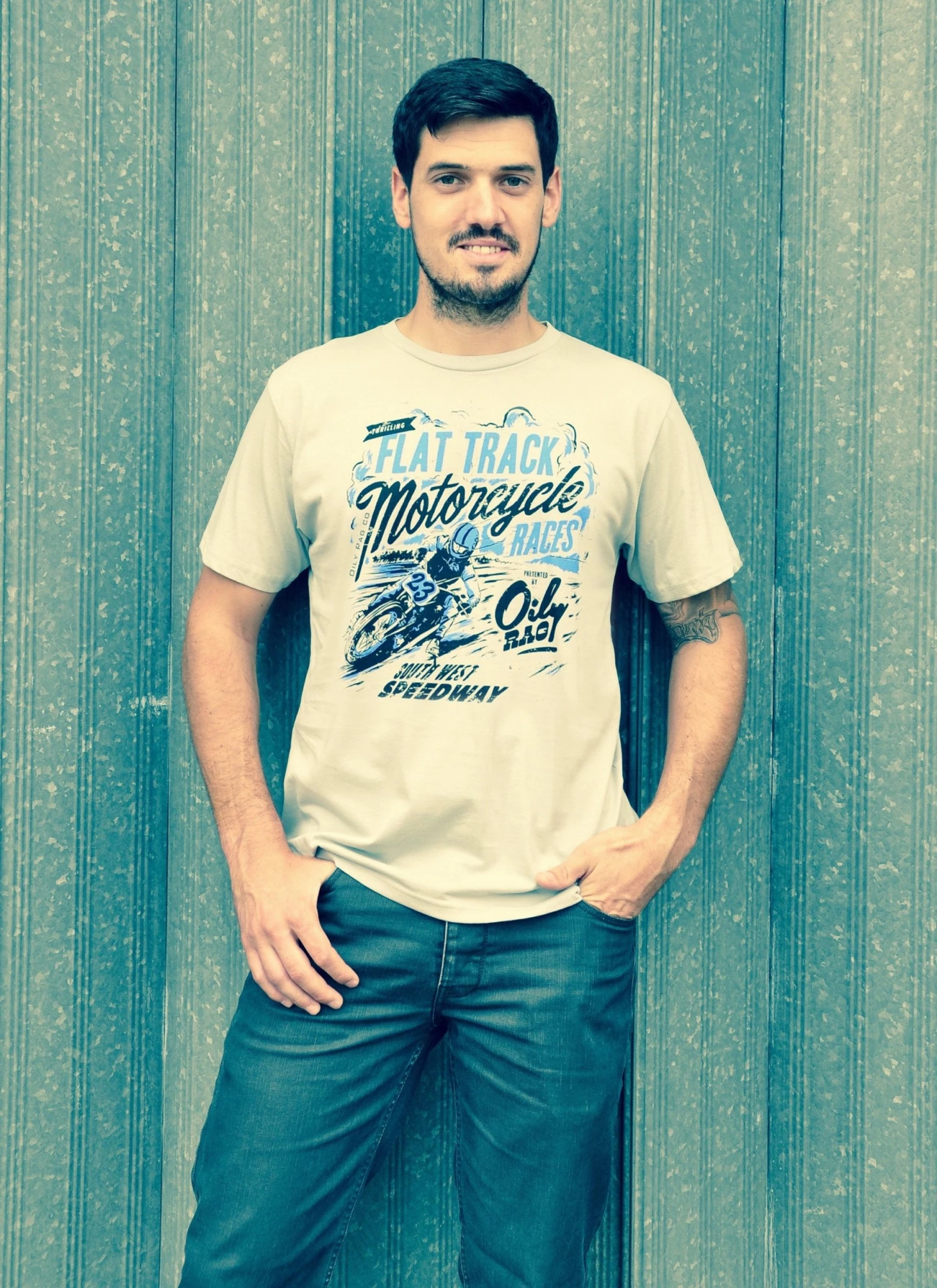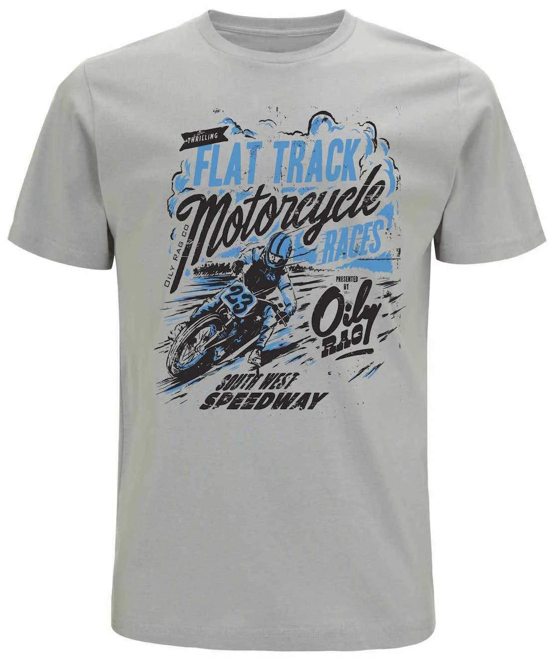 Oily Rag Clothing Flat Trackerย retro style grey brushed organic soft cotton t’shirt. Inspired by high speed dirt! A traditional Oily Rag design for Flat Track racing..