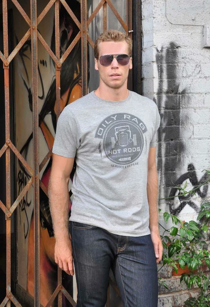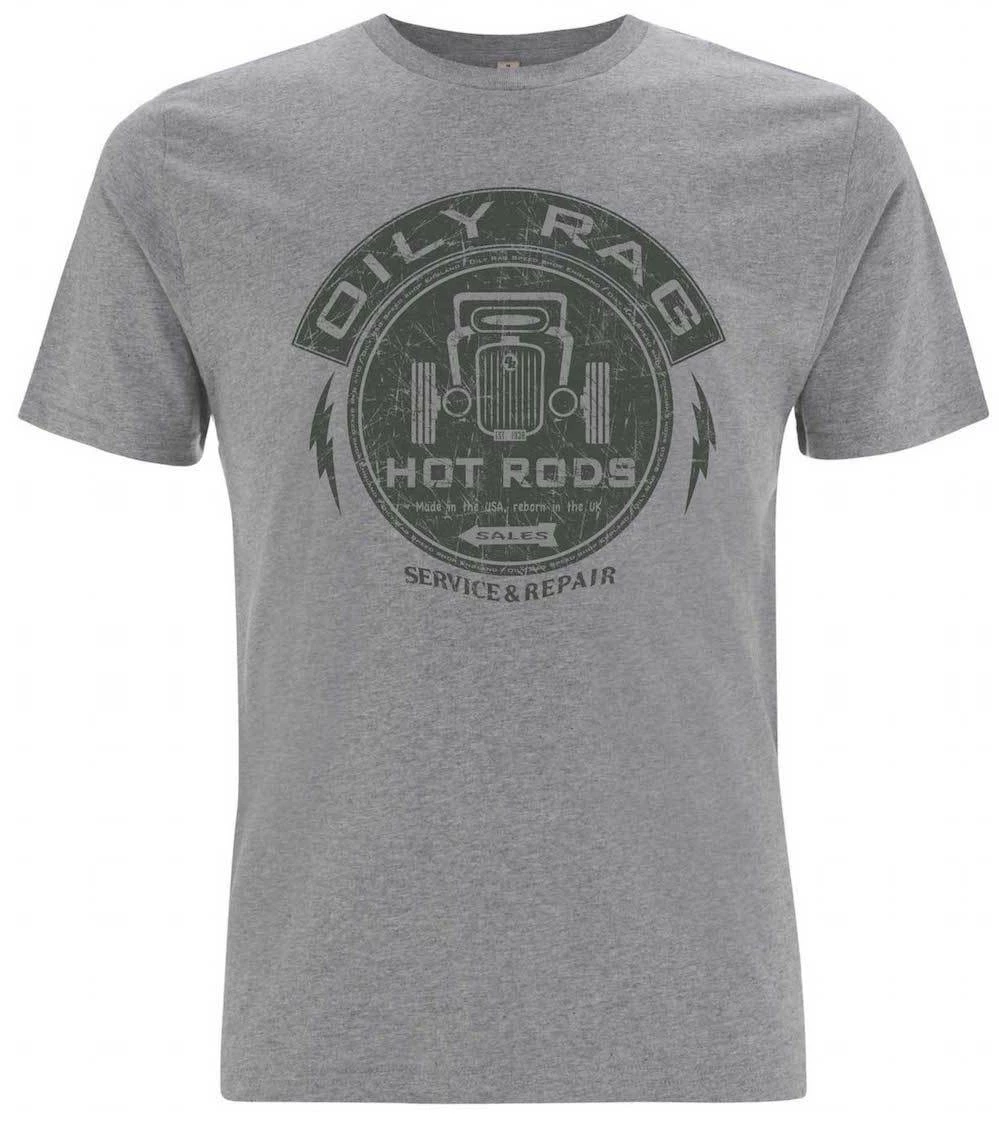 Oily Rag Clothing Hot Rods retro style charcoal grey brushed soft cotton t’shirt, harking back to 1950’s US 4 wheel customising!