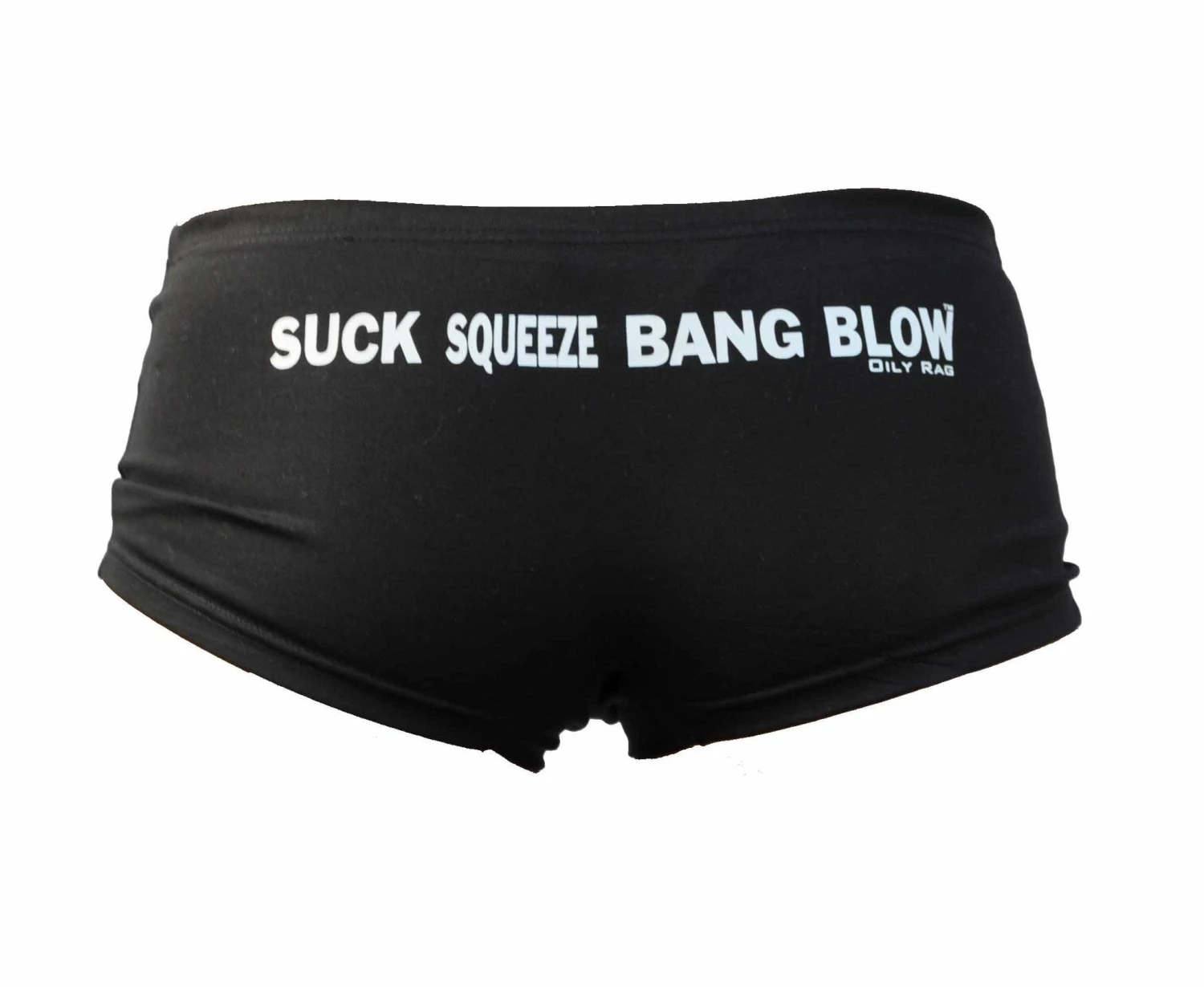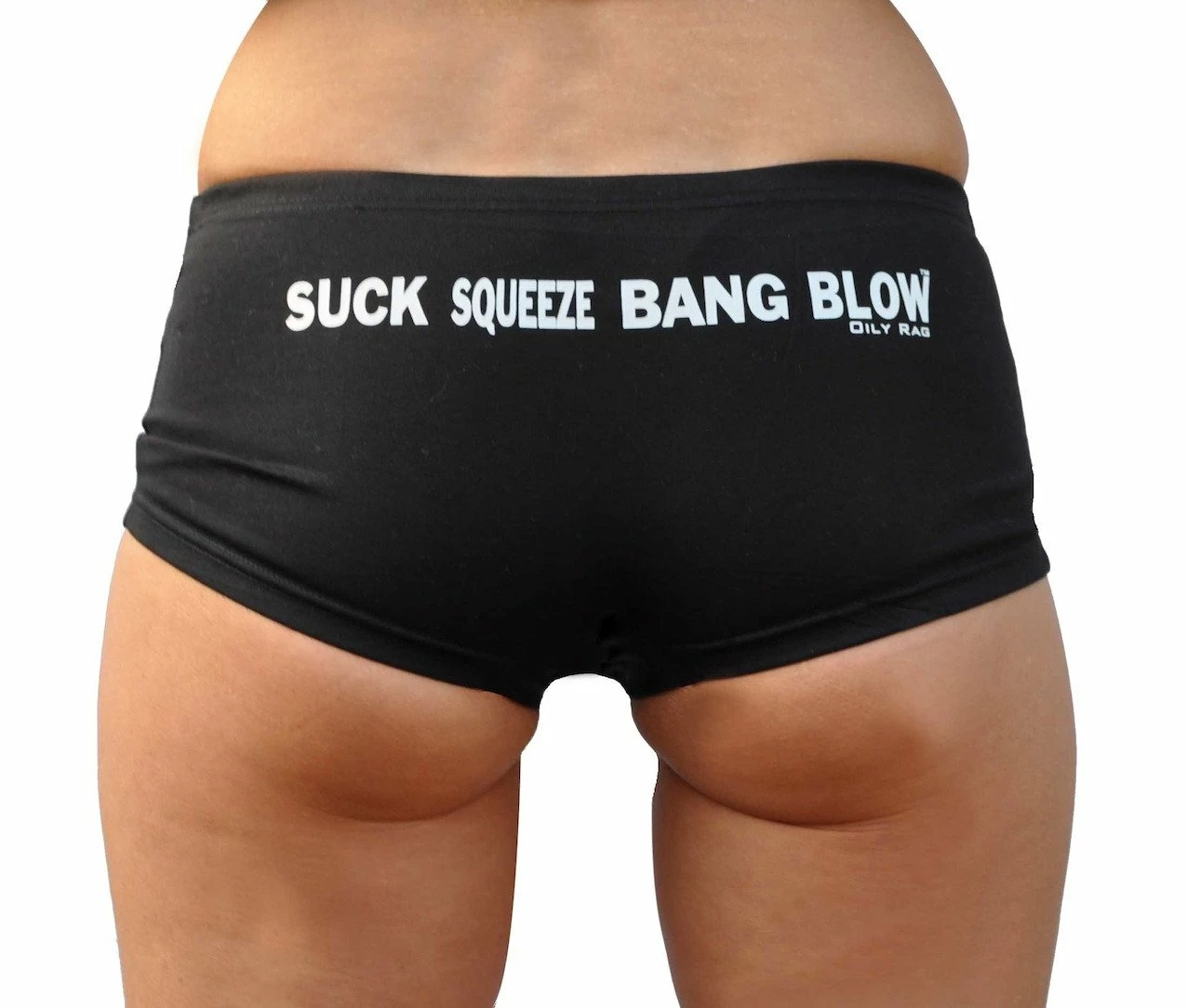 Oily Rag Clothing Ladies Boxer shorts with Oily Rag’s trademarked phrase “Suck Squeeze Bang Blow” across the back. 45% combed cotton 45% modal 10% Lycra Elastane.
