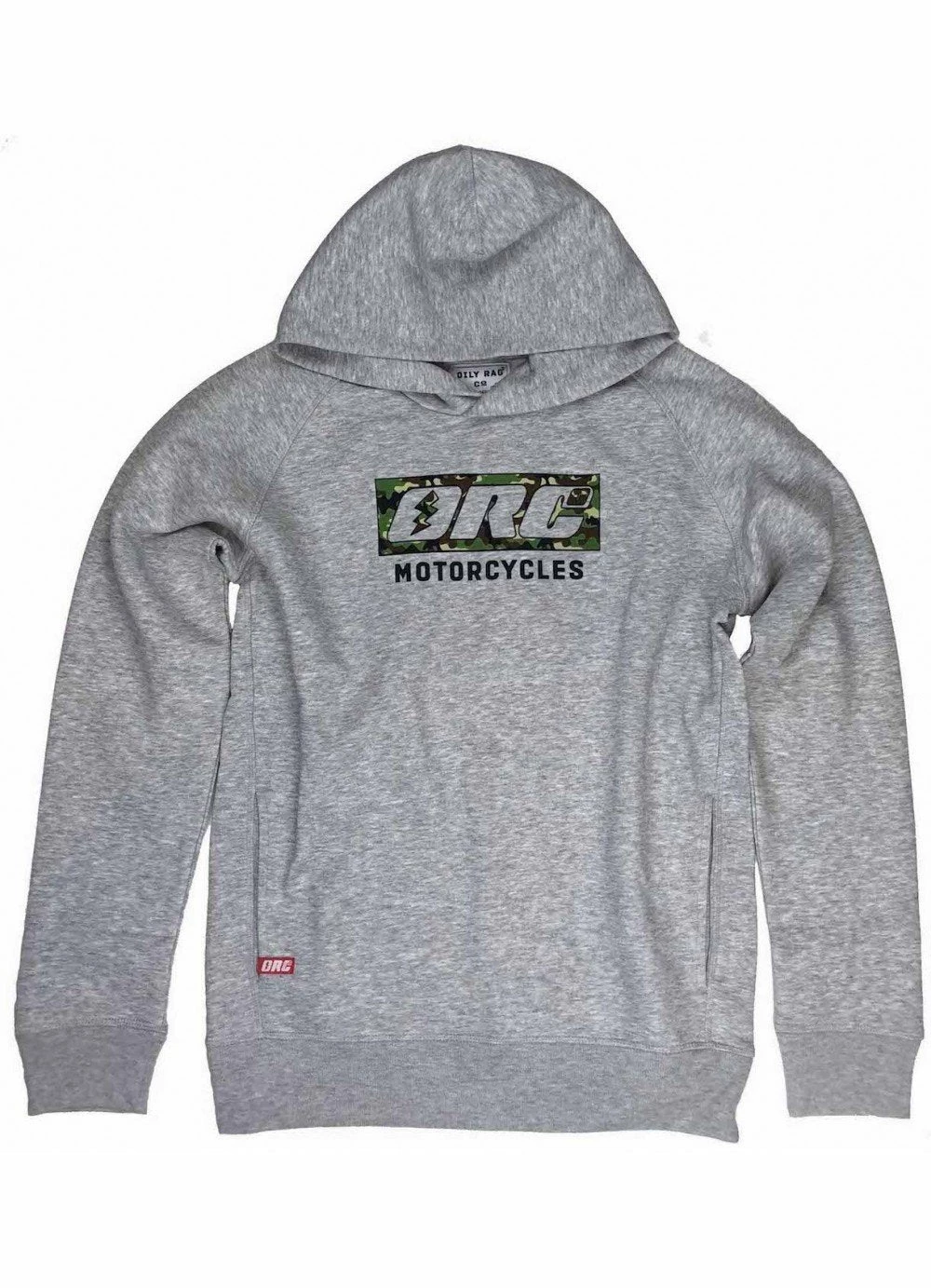 From the Black Label collection, with ORC hem tags, hang tags and neck labels. A pullover heather hoodie with camo colour ORC Motorcycles screen print design, on a 80% Combed Organic Cotton 20% Polyester Sweatshirt. Loopback 3-Ply 320g