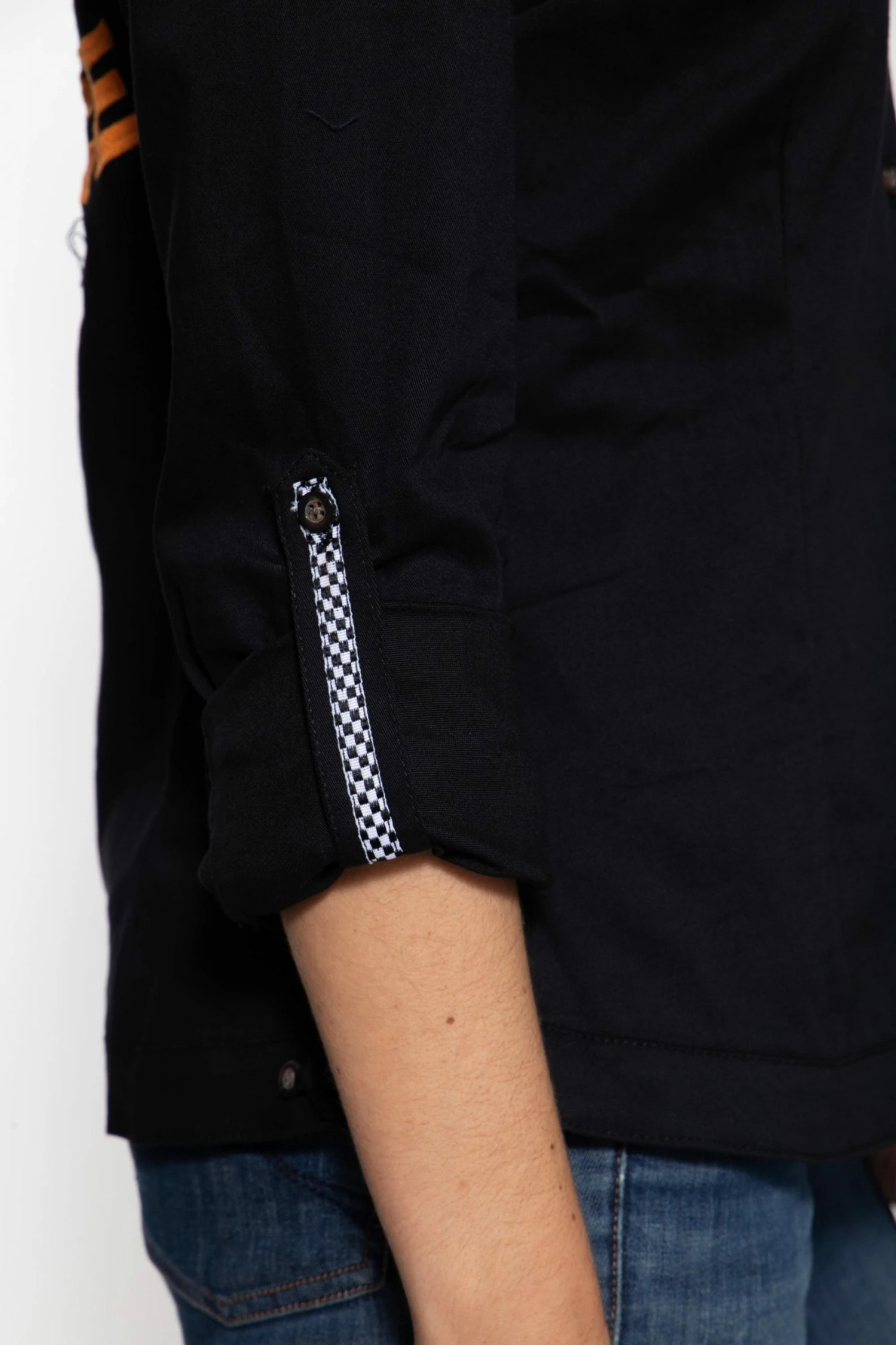 A nice hint of 50’s rock style fashion. This is a vintage black long sleeve tailored ladies shirt.