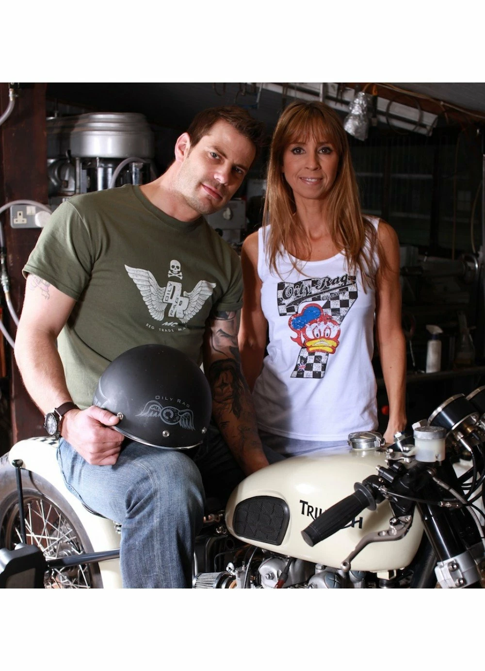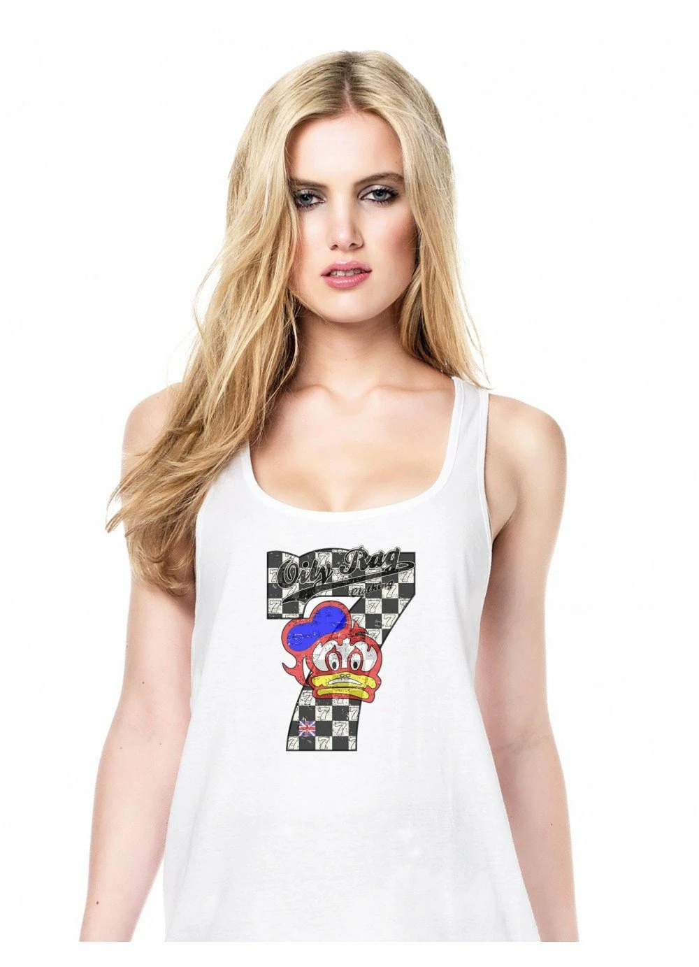 A homage to racing legend, Barry Sheene. Sheene was famous for wearing the number 7 and displayed a duck design on his helmet. Distressed look design. Print transfer on a Pre-shrunk, 100% cotton, 195gsm seamless vest. Double stitched sleeve and waist hem. Colour white.
