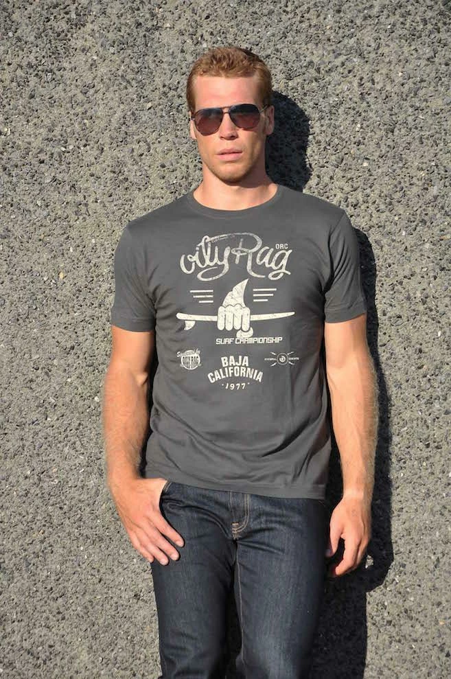 The Oily Rag vintage Californian Surf Competition tee, for the big wave riders, screen printed on a charcoal tee.