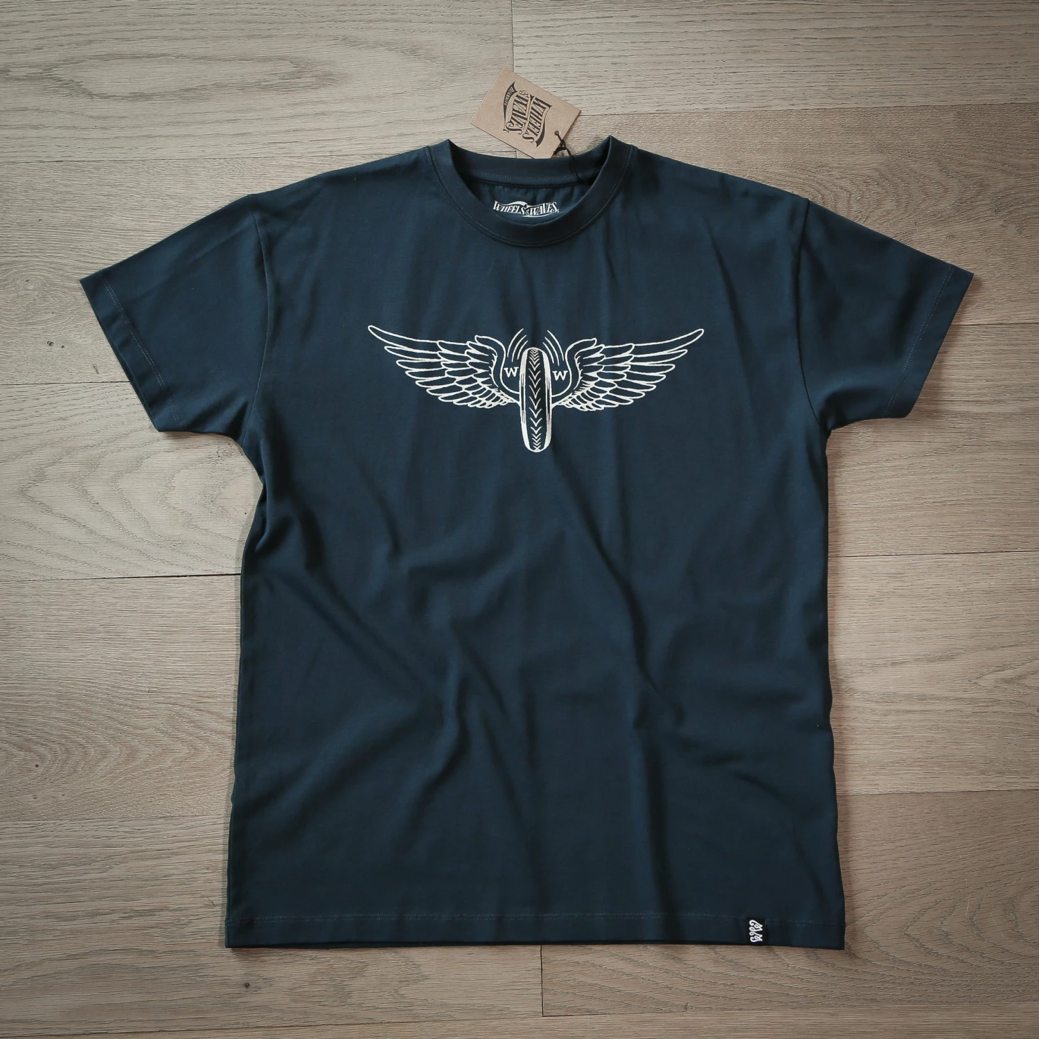 Easy to wear every day, this petrol blue T-shirt is decorated with a discreet design on the chest. From Brooklyn where he works, the Texan illustrator Blaze Ben Brooks imagined for us this winged wheel which is not without evoking the original logo of our collective.