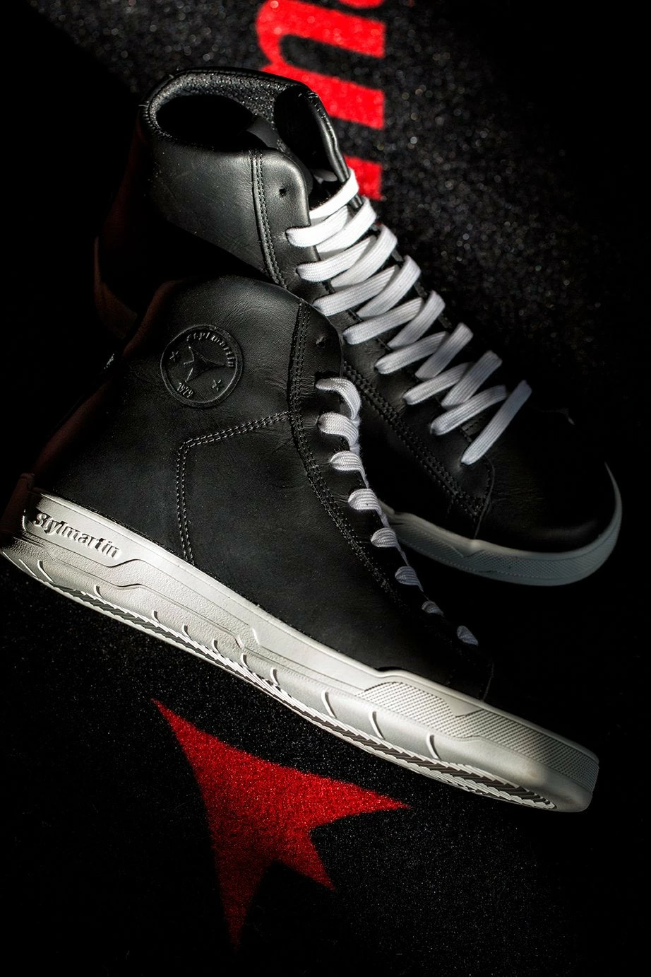 Basketball and college wear-inspired sneakers, minimalist and uncompromising lines, shapes and colours. Characterised by specific stylistic choices, such as full-grain leather, and with key safety features such as PU internal ankle inserts. A boot that perfectly combines metropolitan charm and the spirit of the motorcycling community.