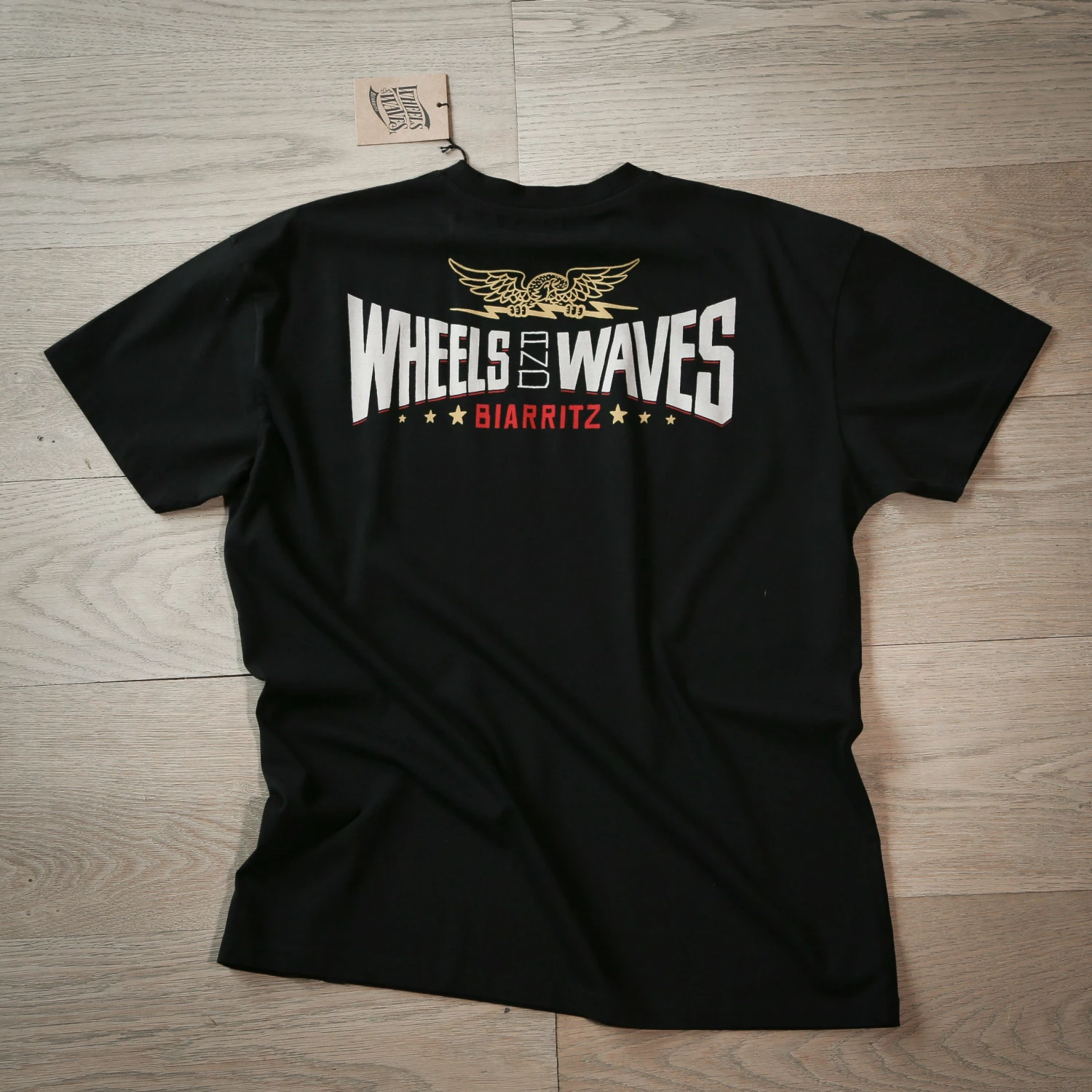 – Woven label Wheels and Waves tag on the bottom left